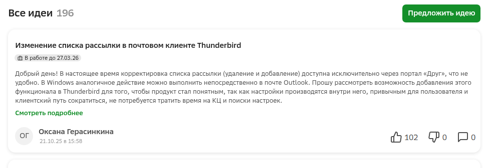 По вопросу клиента о «Группе рассылок», который относится к методологии, была готовая информация. Я регулярно изучаю Базу знаний, стараясь запомнить типовые ответы и служу за всеми изменениями по новостям — благодаря этому большинство решений знаю наизусть и отвечаю оперативно. Чтобы новая, сопровождаемая нами, Почта не проигрывала в функциональности с привычным Outlook, после завершения звонка направила предложение о доработке продукта, оно получило достаточно лайков от пользователей и будет реализовано в 2026 году (скриншот ⬇️):