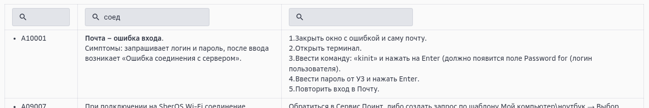 - С клиентом проходим типовые методы решения, адаптированные под проблему. В работе с клиентом мы последовательно применяли решения для проблем с почтой. На этапе удаления системной папки .thunderbird я обратила внимание, что в заявке клиента появился комментарий от ИТ-поддержки с рекомендациями по команде «kinit» . Отмечу, что эта команда присутствует в нашей базе знаний в контексте устранения ошибки отправки писем.