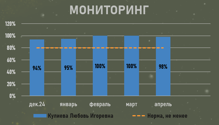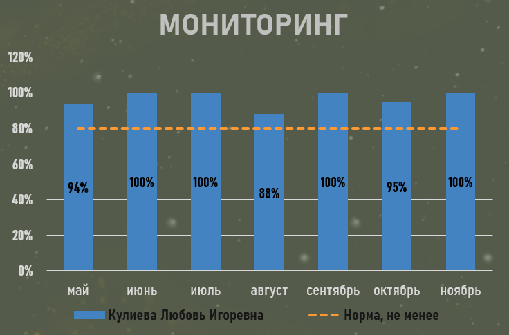 Мониторинг. Моя работа соответствует стандартам на 96%. Критерий оценки: не менее 80% соответствующих кейсов в обеих должностях.