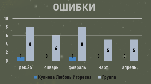 В предыдущей роли за период декабрь 2024 — апрель 2025 у меня было несколько ошибок. Критерий оценки: не более 2-х ошибок за месяц.
