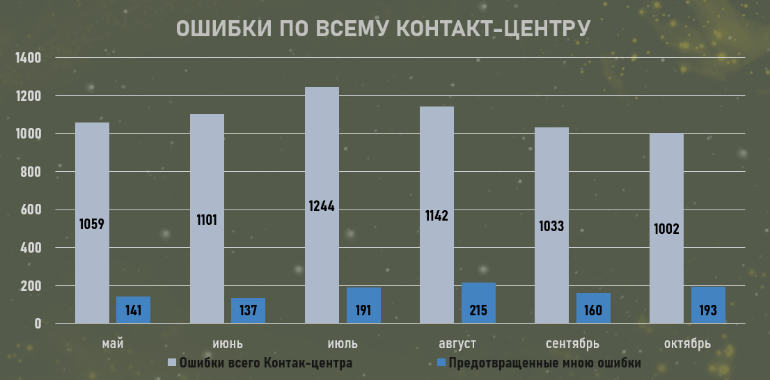 Для сохранения лидерства важно заботиться о клиентах. Это моя ежедневная миссия. Я получаю готовые заказы, в которых есть ошибка. Нахожу ее и исправляю. Таким образом компания получает довольного клиента, который вернется к нам еще. Исправляя заказы, я ежемесячно предотвращаю потери минимум на 220 тысяч рублей, в среднем это 150 заказов в месяц. На диаграмме показано общее количество ошибок по Контакт-центру и количество предотвращенных мною ошибок.