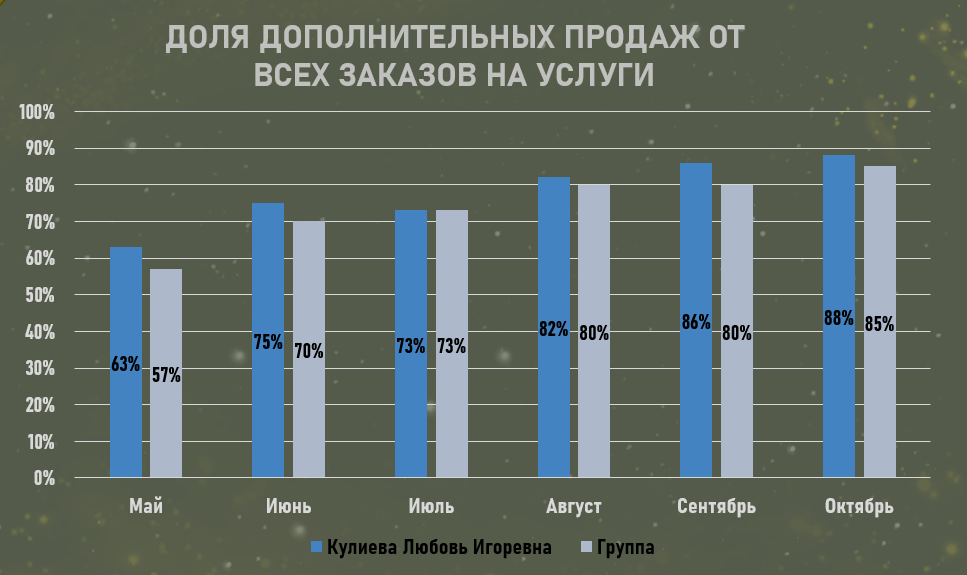Моя результативность измеряется количеством предложенных дополнительных услуг при оформлении заказов на услуги ЭКОсистемы.