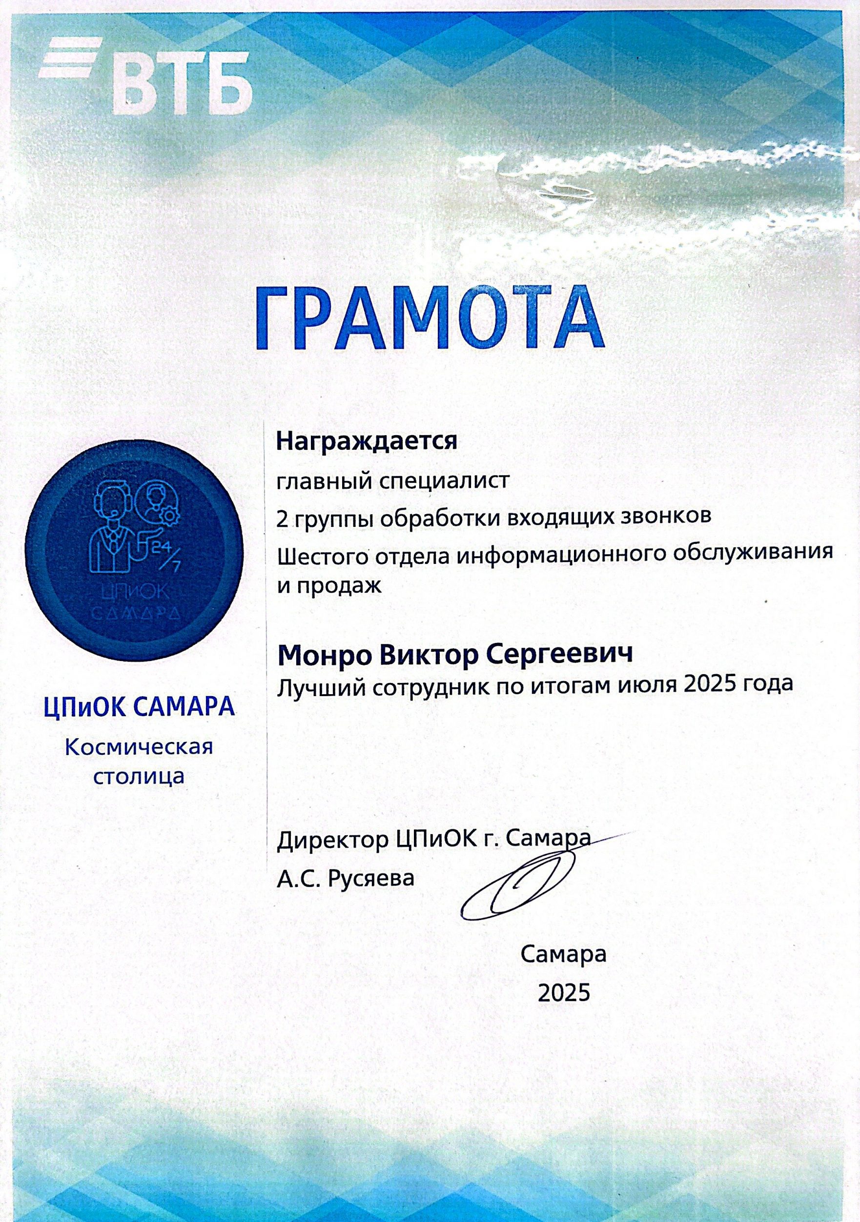В декабре 2024 года я принимаю для себя радикальное решение о смене профессиональной деятельности и перехожу в ВТБ Банк на должность главного специалиста контакт-центра. Я попал в иную реальность: здесь нужно не настаивать, а слышать; не диктовать, а понимать; не требовать, а помогать. Я принял этот вызов и перестроил своё мышление, освоил язык доверия и трансформировал свои ценности.