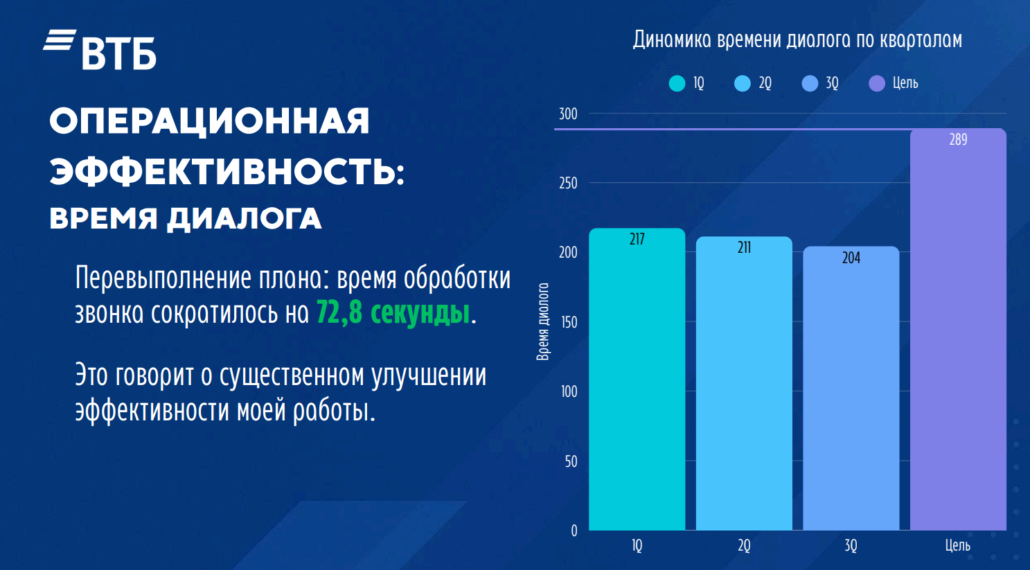 Таким образом, я не просто выполняю задачи оператора контактного центра, а участвую в реализации долгосрочной стратегии ВТБ через качество каждого диалога и поддержку команды, создавая синергию между личным развитием и развитием Банка.