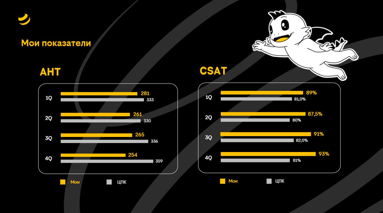 AHT (Average Handling Time) – среднее время обслуживания одного клиента. Я выполняю необходимую норму и даже превышаю её. Это позволяет мне обработать больше запросов и предоставить клиентам быстрые и эффективные решения. Цели по этому показателю в моем основном направлении–330 секунд на один диалог, мой средний результат 263 секунды.