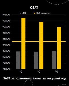 CSAT — показатель удовлетворенности клиента моей консультацией по её завершению. Целевое значение — 85%. Я же в среднем выполняю его на 91% и выше.